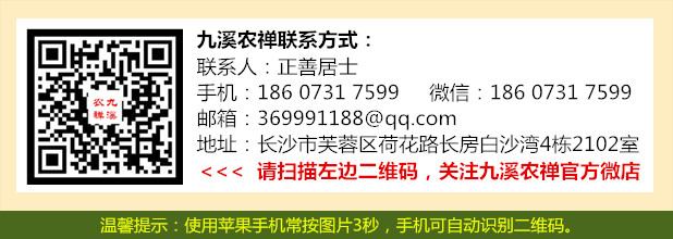 九溪农禅是九溪古寺响应宗教自养的政策,将农禅社自产的特色“农禅品”与广大信众结缘,农禅社收益部分用于九溪古寺的重建资金和九溪古寺慈心社的助学帮困善款。