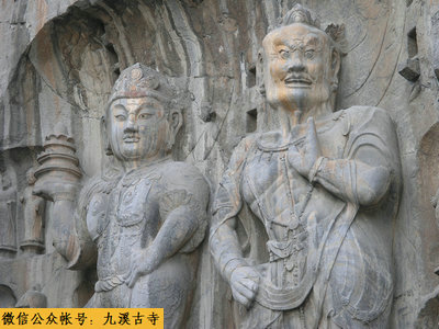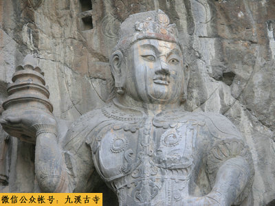 整个奉先寺的雕塑群是一个完美的艺术整体。卢舍那大佛侧旁还有其弟子阿难、迦叶、胁侍菩萨和力士、天王的雕像。这些雕像,有的慈祥,有的虔诚,再看边上的天王、力士像,则是面目狰狞、咄咄逼人,把主像烘托得更突出。